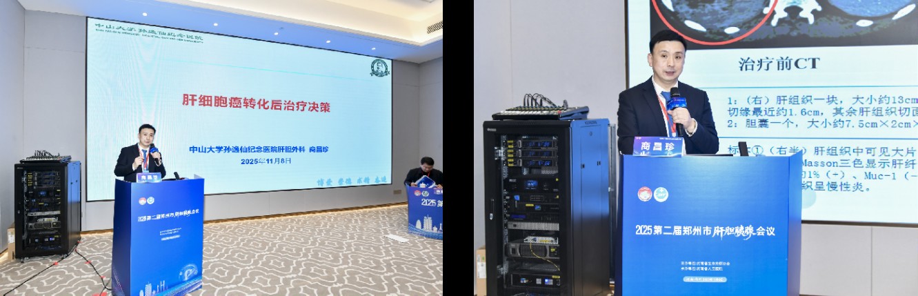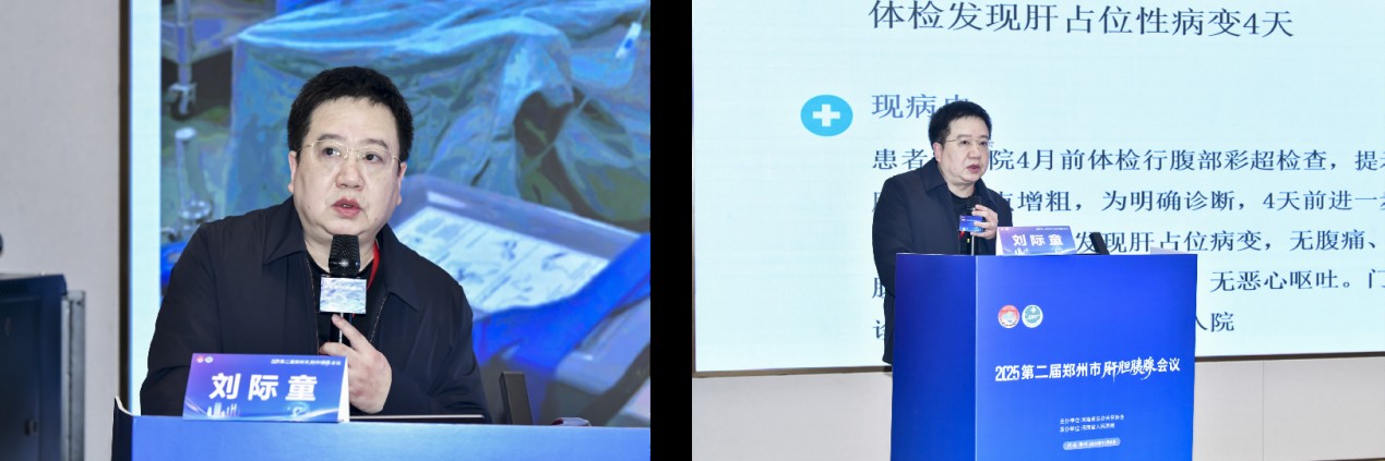 随后,会议进入又一精彩环节。在周口市中心医院陈昕教授、河南省人民医院辛维政教授与郑州大学第二附属医院刘新江教授的联袂主持下,现场学术氛围浓厚。郑州大学第一附属医院郭文治教授与湖南省人民医院刘际童教授相继登台,分别以《肝细胞癌免疫治疗格局的发展与探索》和《肝胆手术术中气栓防治》为题,奉献了两场极具深度与启发性的学术演讲。郭文治教授系统梳理了肝癌免疫治疗的前沿动态与发展方向,刘际童教授则聚焦于手术安全,深入讲解了术中气栓防治的关键技术与实战策略。两位专家的分享内容翔实、见解独到,引发了在场同仁的广泛共鸣与热烈讨论。