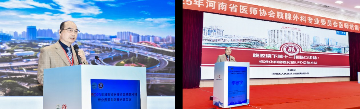 在第一部分学术环节,由河南省人民医院胡明星教授、河南省肿瘤医院周进学教授、郑州市中心医院季予江教授及河南科技大学第二附属医院张景春教授联袂主持。随后,广东省中医院谭志健教授、河南省人民医院秦涛教授、南京医科大学第一附属医院蒋奎荣教授依次带来精彩分享,他们分别以《胰腺手术新概念——LPD血流控制技术》《十二指肠解螺旋在胰十二指肠全系膜切除中的应用》及《胰腺手术血管切除与重建》为题,呈现了三场兼具创新理念与实践深度的学术报告。整场演讲内容翔实、见解独到,既有对技术细节的精妙剖析,也有对术式理念的前瞻思考,为与会同仁带来了一场层次丰富、启发思维的学术盛宴。
