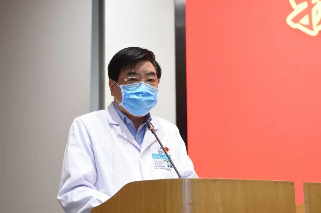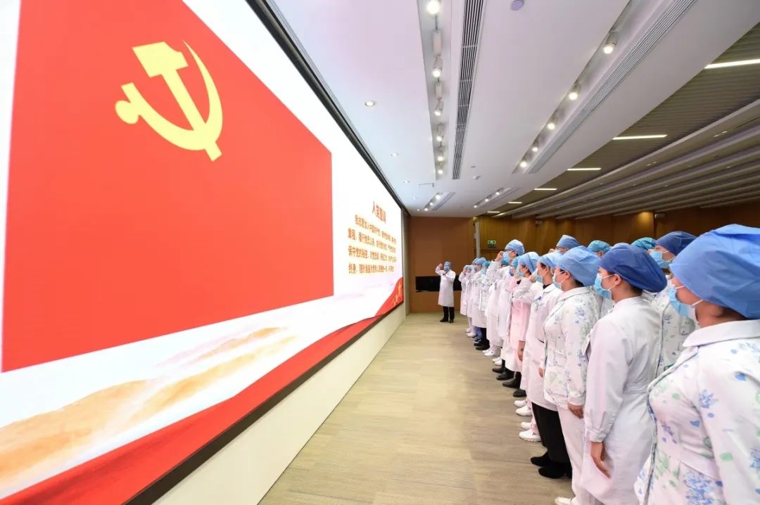 在宣誓仪式现场,在抗击新冠肺炎疫情中表现突出的优秀共产党员、急危重症医学部主任秦秉玉上台领誓,29名火线入党的医务人员现场进行了庄严宣誓。