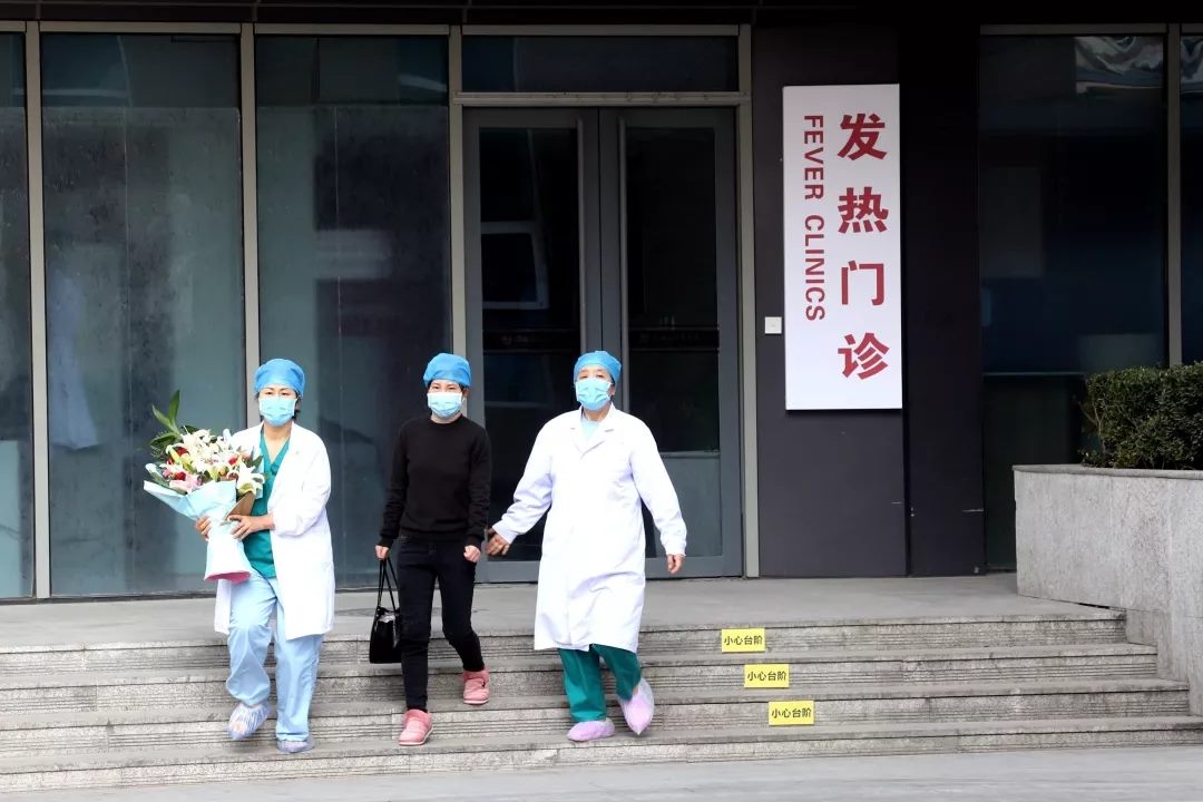 12时19分,河南省人民医院感染科主任医师尚佳、护理部副主任张俊梅陪同着治愈的唐女士,走出公共卫生医学中心隔离区。