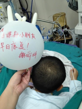 这个气球造型好别致啊!还带了几个小耳朵……等等,那貌似是几根“手指”,难道,这是手套吹成的气球?没错,这就是医用橡胶手套,吹饱气后,就成了孩子们的绝妙玩具。瞧,护士阿姨还在气球上为小患儿写上了祝福的话!