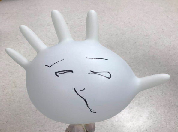 在旁医务人员立刻想方设法安抚,但哭喊着要妈妈的小雨怎么也止不住大哭,完全无法配合诊疗。怎么办?此时,作为诊疗操作医生的呼吸与危重症医学科张群成主治医生急中生智想出一条“妙计”!已经是两个孩子父亲的他是朋友和同事们公认的“超级奶爸”,哄娃“有一手”。只见他轻轻地搂着小雨,临时迅速脱去口罩,拿起一只医用手套,微笑着告诉小雨:“叔叔要开始变魔法啦,看仔细喔!”吸气,吹气,再用笔画上可爱又搞怪的五官,不出5秒,就有了前面照片中那个逗乐的卡通气球!加上充气隆起的五个手指,活像一只调皮的八爪鱼。