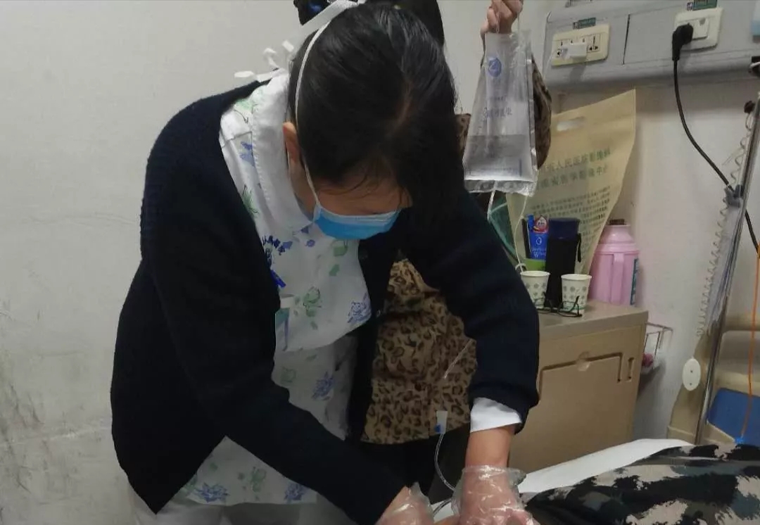 当时,一名危重患者急需进行剖腹探查术,由于其并发症非常严重,为了能在最短时间内找准角度,手术部樊孝文护士选择跪在地上为患者静脉穿刺。