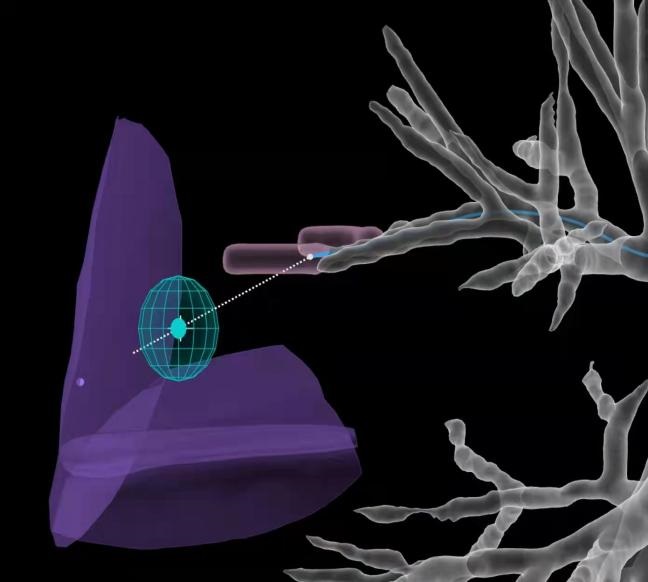 患者67岁,胸部增强CT提示右肺上叶有一结节,迫切需要明确其性质。但这一结节生长部位靠近肺部外周,传统支气管镜下操作难以到达并获取组织样本。经过详细讨论及多学科会诊,使用Ion肺部微创活检机器人手术成为最理想的选择。相较于传统支气管镜,Ion肺部微创活检机器人的导管外径缩小到3.5毫米,还可以180°旋转移动,到达更远、更细的支气管,探清更加复杂的肺内环境并取到距离胸膜、血管、心脏更近的目标组织。