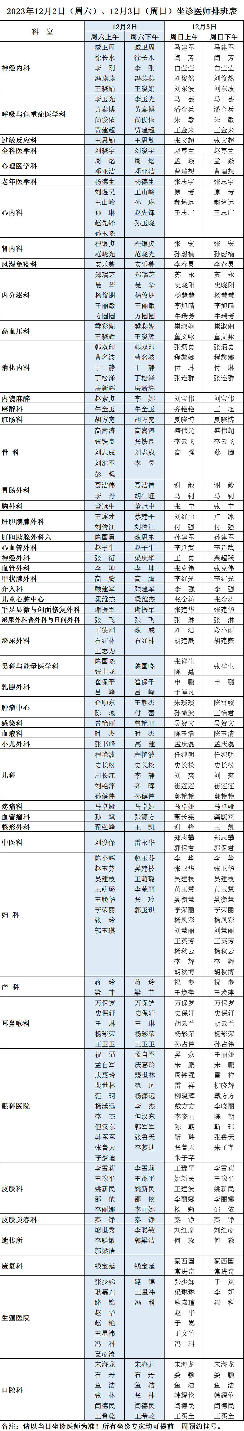 2023年12月2日(周六)、12月3日(周日)坐诊医师排班表