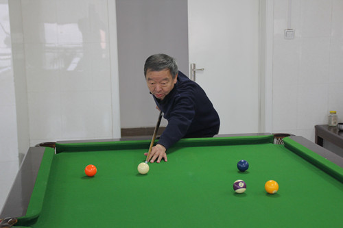 为了丰富老同志的业余文化生活,离退休职工服务处每年3月至6月举行单项小型运动会,图为老同志参加台球比赛: