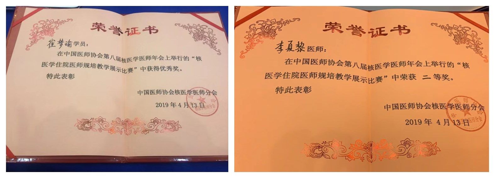 2014年成立核医学住院医师规范化培训基地接受首批规培学员,现已结业16人,规培结业综合考核及执业医师资格考试通过率均为100%。基地住院医师规范化培训成绩突出,基地主任获得2017年核医学住院医师培训专科基地评估获先进个人。科室带教师资及规培学员在2019年4月“核医学住院医师规培教学展示比赛”中分别荣获优秀教师二等奖及规培学员优秀奖。