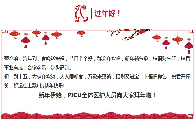 在新春佳节来临之际,PICU全体医护人员祝大家新春愉快、狗年大吉、阖家幸福!一年之计在于春,让我们以今天为新的起始点,在新的一年里,牢记新的使命:服务患儿、守护健康、砥砺前行!