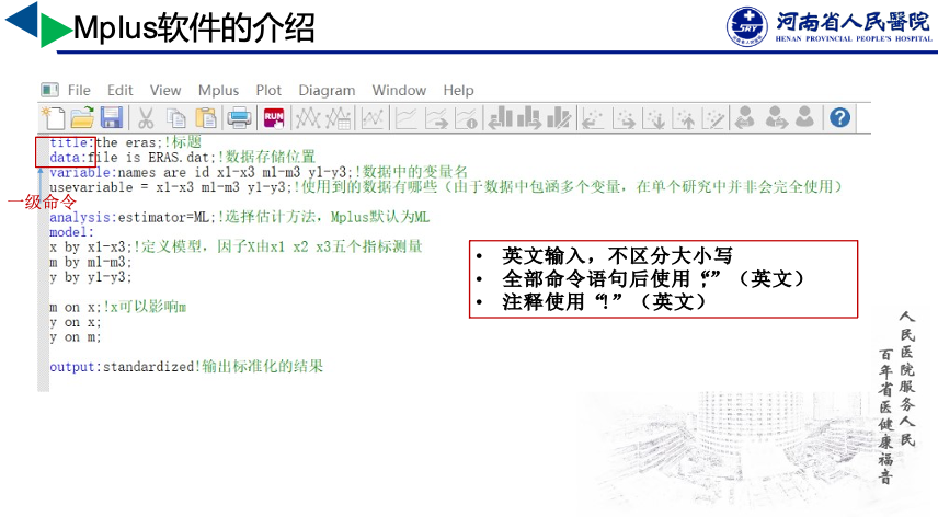 Mplus是一款统计建模编程软件,可以处理探索性因子分析、验证性因子分析、结构方程模型等,具有功能强大、操作简单的特点。研究生护士田亚杰依次介绍了软件界面和功能、数据导入与前期处理、语法结构、常用命令等。接着,回顾了验证性因子分析(Confirmatory factor analysis, CFA)的基本内容和Mplus实现过程,并现场使用软件进行实操,逐项解读结果的含义,加深大家的理解。