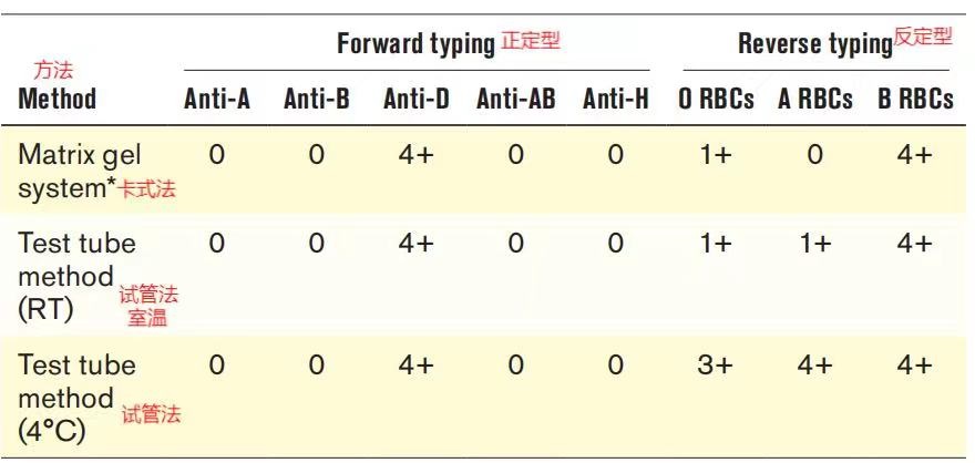 使用抗-Lea和抗-Leb鼠单克隆抗体检测,发现患者的红细胞表型为Le(a-b+)。使用AABB输血技术手册中描述方法,用不同表型的红细胞对血清进行冷反应性抗体的鉴定(下表)。