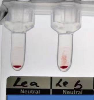 此外,患者的血清用含H物质的唾液进行测试,患者的抗体没有显示出任何抑制H物质的结果。这一发现是抗-HI 的典型表现,与抗-H不同,它不受唾液H物质的抑制。因此,推断患者血清中有抗-B和抗-HI。