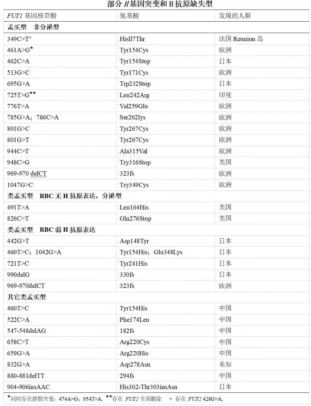 FUT1(H)突变产生H缺失型表型,突变使FUT1失去活性,不能编码生成岩藻糖转移酶,则细胞表面无H表位形成。分泌液中的H抗原,是由FUT2(Se)基因编码的岩藻糖转移酶所合成的。孟买型人FUT1(H)和FUT2(Se)等位基因都发生了突变,不能表达相应的岩藻糖转移酶,红细胞和分泌液中都缺少H抗原。