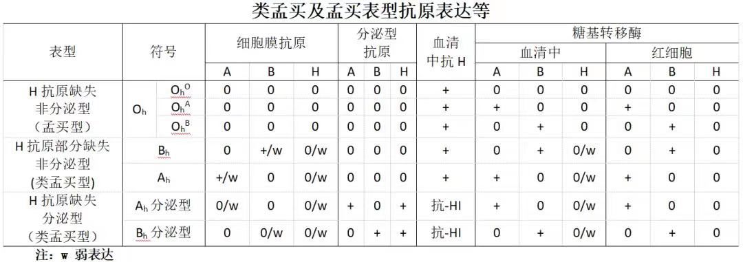 在非分泌型人的类孟买型,一些Ah型人的红细胞表达的A抗原类似于A2,而另一些人红细胞表达的A抗原则类似于AX,只与一少部分O型人的抗人血清发生凝集反应。Bh与抗-B血清反应为弱凝集。但是Ah和Bh均无H抗原表达,与抗-H不反应,或有很少量H抗原,与抗-H呈弱反应。在唾液中无ABH抗原物质存在。其血清中都含有抗-H。
