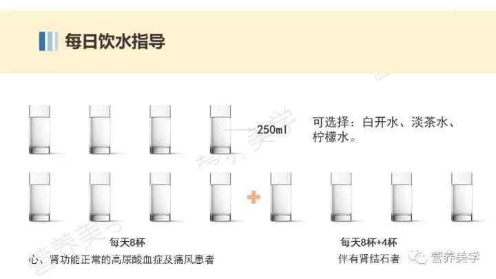 适量的补充水分是防止痛风发作或恶性肿瘤化疗后引起急性痛风发作以及减少尿酸结石形成中一项重要的措施。